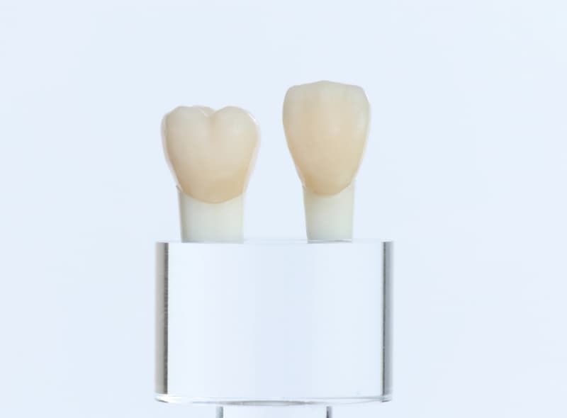 非常に高い強度を持つセラミック素材で、強い力がかかる奥歯にも適しています。耐久性に優れ、すり減りや変色が少ないのが特徴です。白く自然な見た目で金属アレルギーの心配もありません。